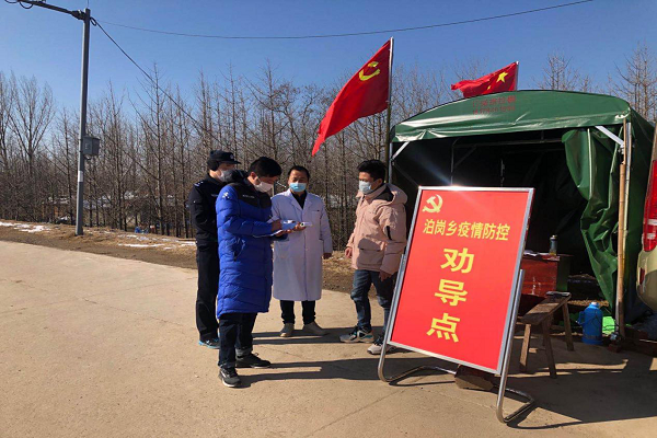 在泊岗乡东西两个出入口,“泊岗乡疫情防控劝导点”几个显眼的大字、一块鲜红的警示牌为泊岗乡拉起了警戒线。过往行人车辆在看到警示牌后,纷纷主动停车驻足,配合卡点防疫工作人员登记信息、检测体温,乡村干部和全乡村民众志成城、万众一心,坚决守住红色警戒线。