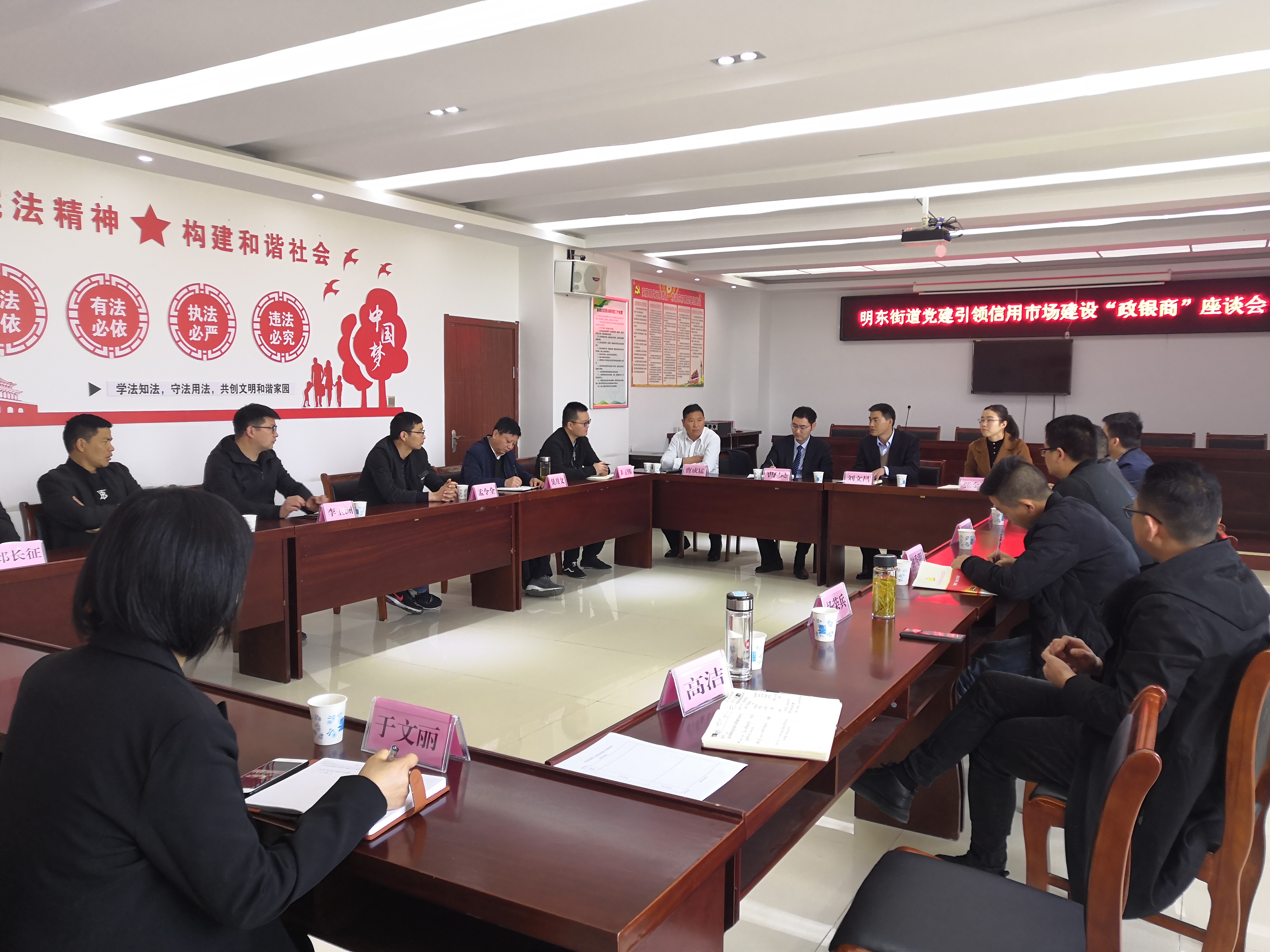 4月23日上午,明东街道党建引领信用市场建设“政银商”座谈会在新塘社区召开。会议由街道党工委组织委员张金玉主持,安徽明光民丰村镇银行副行长刘文昌、授信部总经理,星光商贸城、恒正商贸城开发商负责人、物业负责人,商贸城全体党员商户,新塘社区党总支书记参加会议。