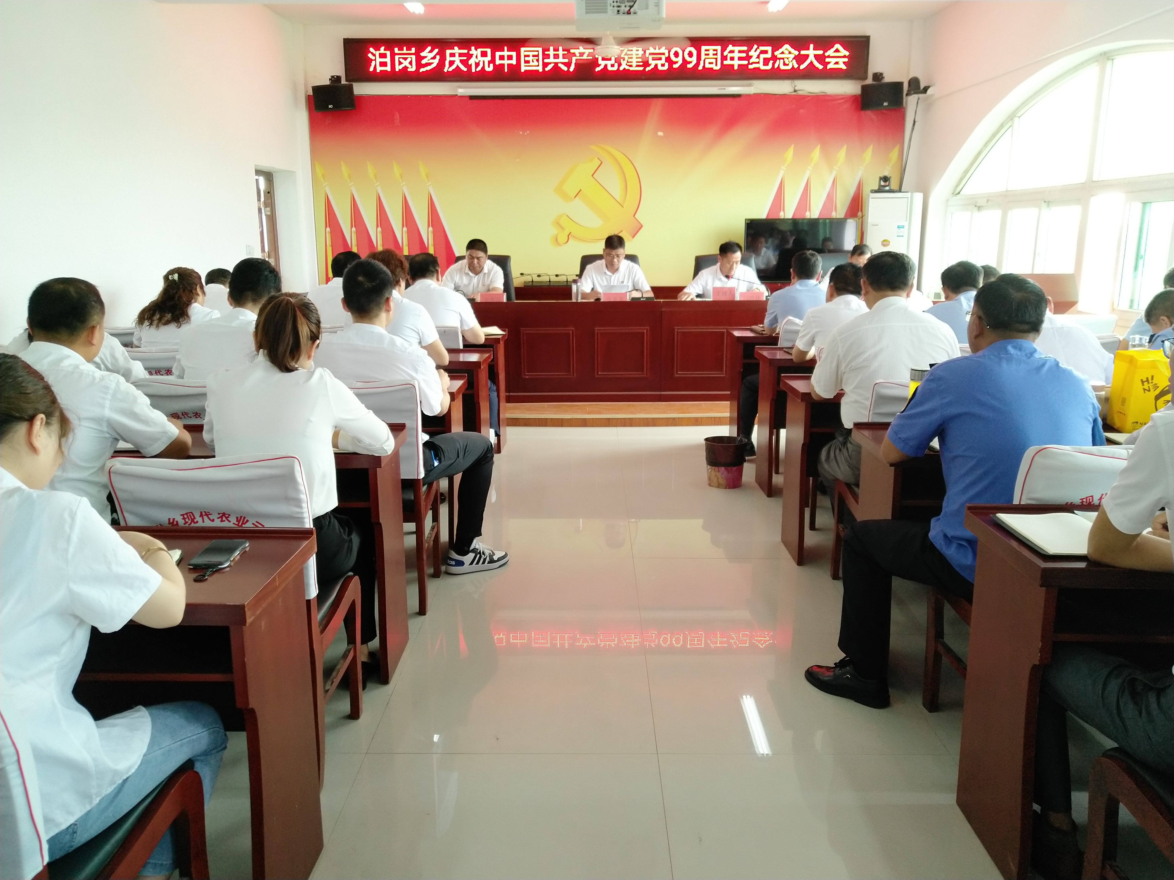 7月1日上午,泊岗乡召开庆祝中国共产党成立99周年纪念大会,会议由乡党委副书记、乡长闫德林主持,全体乡干部、各村党(总)支部书记、各村主任、组织委员、各机关单位党支部书记、部分泊岗乡第十四届党代会代表参加会议。