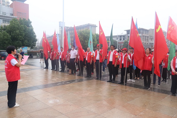 7月11日上午,南湖广场上彩旗飘扬、人声雷动,明光街道“万人文明劝导”集中行动在这里举行。