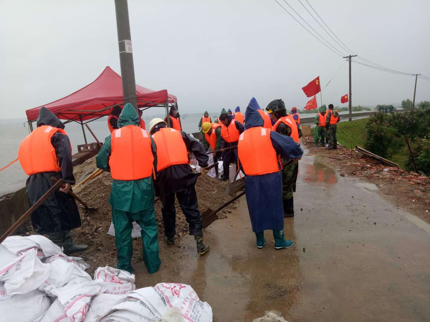 一名党员一根桩,多个党员就形成一堵墙 。3.6公里,是红旗圩大堤的总长度,也是汛期石坝镇党员干部志愿者的“责任段”。近日,笔者来到这里,坝上不断有人冒着烈日来来回回巡查,每隔约300米,就能看一个简易的工棚,工棚外鲜红的党旗格外夺目,这就是一个党支部,它们就像一个个战斗堡垒,矗立在空旷的大堤上。这段时间以来,堤坝已经处置大大小小险情多处,“每一个险情的发现,都是巡堤人员细心、勤劳、责任心的具体体现,他们做到勤巡查,早发现,及时报告,及时科学处理。每一处险情的化解得益于统一化、规范化、科学化防汛。一个党员一个桩,多个党员就形成一堵墙。现在是党员带头干,群众跟着干了。大家心往一处想,劲往一处使,拧成一股绳了,我们每个共产党员都要做好这样的“桩”,桩多了,桩桩相靠,就形成“墙”,为人民避风遮雨,对社会尽职尽责,对祖国赤胆忠心。