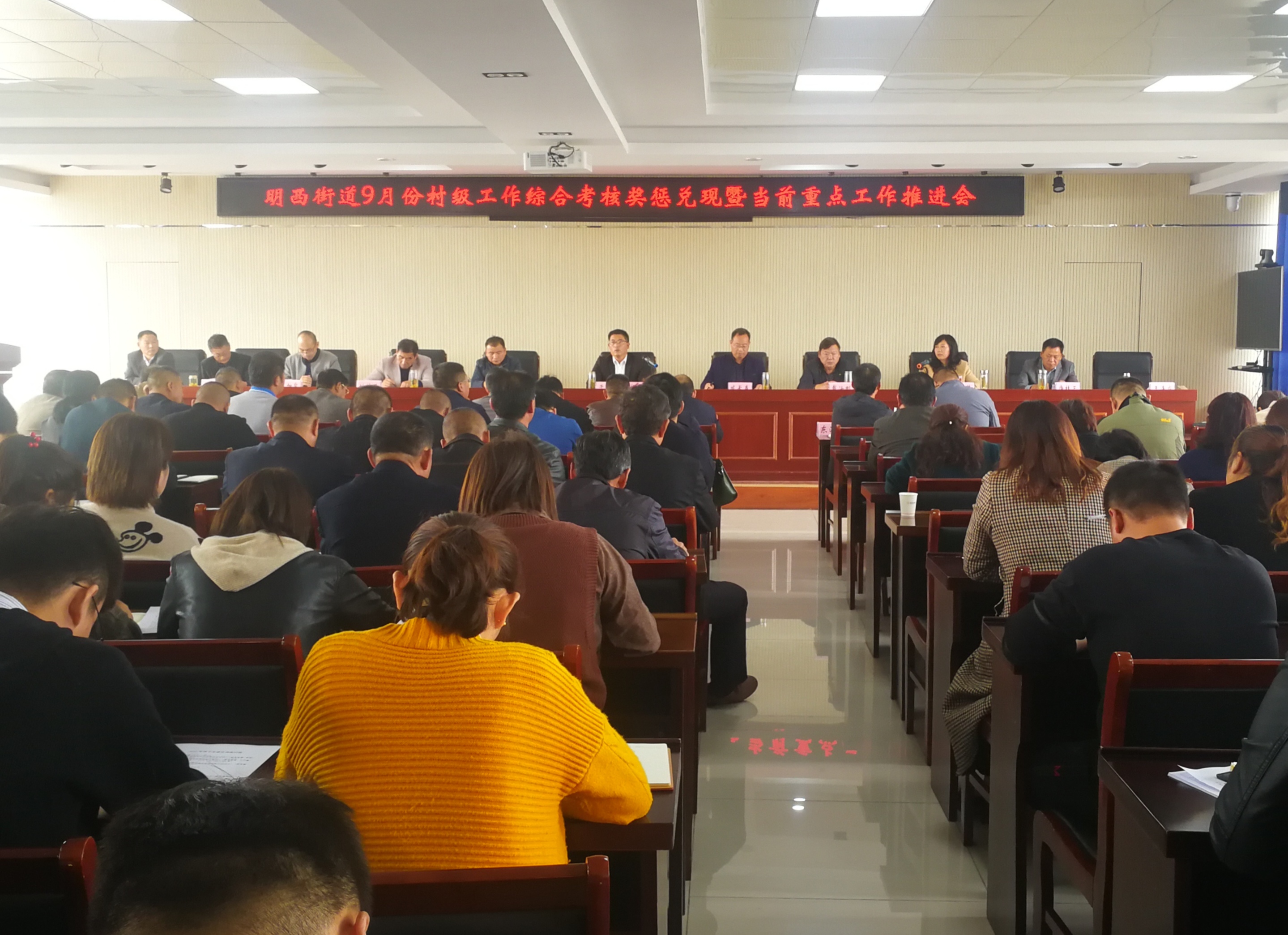 为进一步转变工作作风,提升工作效能,规范提升村级工作水平,激发村“两委”干部干事创业热情,切实解决“干与不干、干好与干坏一个样”的问题,10月27日上午,明西街道召开9月份村级工作综合考核奖惩兑现暨当前重点工作推进会,会议由街道党工委书记于文龙主持,街村全体工作人员参会。
