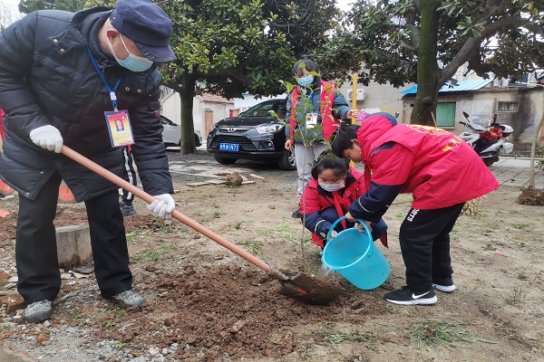 活动现场,在职党员、入党积极分子、小学生们热情高涨,挖坑、搬树苗、挥锹铲土、填土压实、提水浇灌,大家三俩一组,通力合作,干劲十足。仅一个小时,事先准备好的9棵树苗就栽植好,为美丽的环府巷巷道环境增添了一片绿意和活力。