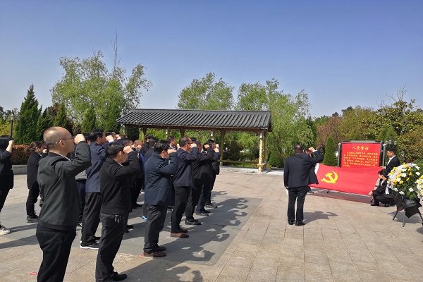 在烈士纪念碑前,全体党员列队肃立默哀,向革命烈士敬献花篮,并面向鲜红的党旗,坚定地举起右拳,重温入党誓词,表达对革命先烈的缅怀之情,再一次接受党性洗礼。