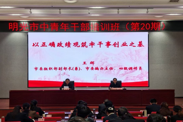 王辉围绕“以正确政绩观筑牢干事创业之基”为学员上了一堂专题党课。他充分肯定了此次培训班取得的成效,结合树立和践行正确政绩观学习教育与中青年干部成长实际,勉励大家坚定政治信仰、提升履职能力、勇于担当实干、严守纪律底线,始终以正确政绩观领航定向,把学习成果转化为干事创业的强大动力,争当信念坚定、本领过硬、务实担当、清正廉洁的标杆,以过硬作风与实干实绩为明光高质量发展贡献中青年干部力量。